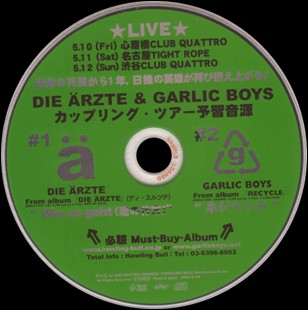 Jahr: 2002 Diese Split Promo-CD diente zur Promotion der "Die Ärzte * Garlic Boys Coupling Tour 2002" in Japan und wurde dort auch nur in sehr begrenzter Anzahl veröffentlicht und ist somit extrem rar. Es befinden sich jeweils ein Song von die ärzte und den Garlic Boys auf der CD. Gleichzeitig bewarb diese Promo-CD die jeweiligen Alben der beiden Bands, zum einen "Die Ärzte (Japan Edition)" und zum anderen "Recycle" von den Garlic Boys. Die CD erschien ohne Cover. |